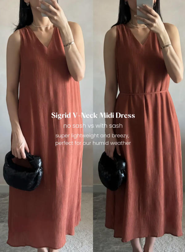 Lightweight and airy, this dress is a dream for warm days. The V-neck cut gives it a flattering shape, while the breezy fabric ensures all-day comfort. It's the kind of piece that can easily be styled up with sandals and jewelry for a brunch date, or kept casual with sneakers for errands. Another plus? Its relaxed fit is perfect for staying comfortable after a big meal—no fuss, just effortless style.