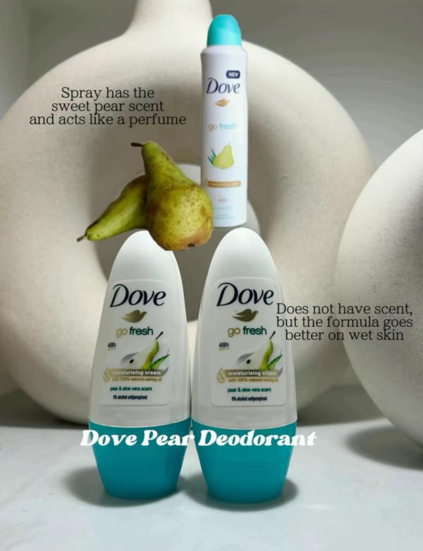 This pear-scented deodorant is like a gentle perfume in a spray bottle. The fragrance is rich and true to the sweet pear, without being overpowering. Its unique scent sets it apart from other fruity products, offering a natural yet delicious pear aroma. The formula is smooth and effective, though it's best applied to dry skin to avoid crumbling. An added bonus is that Dove is now cruelty-free, which makes this product even more appealing.