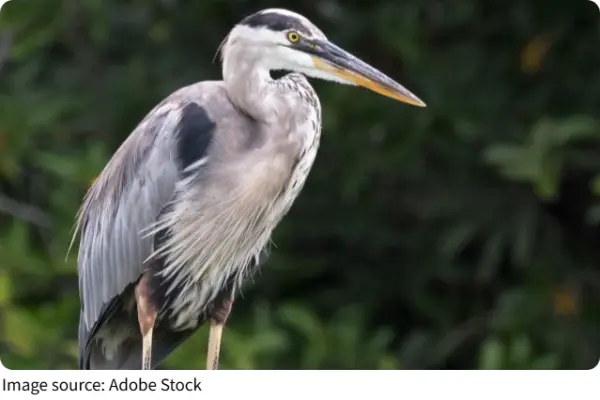 The great blue heron is the largest heron in North America, measuring up to 1.3 meters tall with a wingspan of around 2 meters. Its slate-gray-blue feathers, long legs, and sharp yellow bill make it unmistakable.